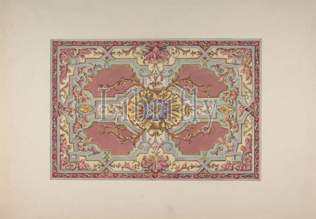 Design, Painted Ceiling, Strapwork, Foliage, Rose Background, second half 19th century, Pen, black ink, watercolor, gouache, 7 3/4 x 11 5/8, 19.7 29.5 cm, Drawings, Jules-Edmond-Charles Lachaise, French, died, 1897, Eugène-Pierre Gourdet, born Paris, 1820