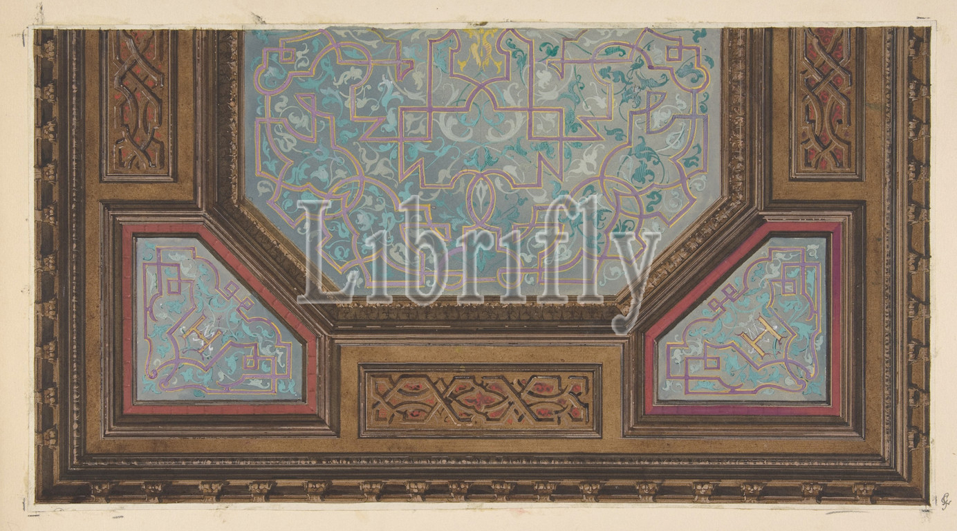 Design, painted decoration, coffered ceiling, monogram, H, 1830–97, pen, ink, watercolor, wove paper, sheet, 6 11/16 x 12 3/8, 17 31.5 cm, Drawings, Jules-Edmond-Charles Lachaise, French, died, 1897, Eugène-Pierre Gourdet, born Paris, 1820