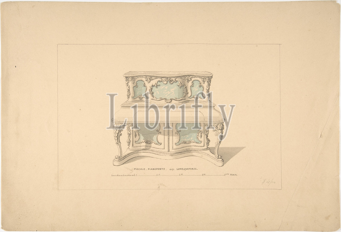 Design, Piccolo Pianoforte, Louis Quatorze Style, 1835–1900, Ink, graphite, watercolor, Robert William Hume, British, London, 1816–1904, Long Island City