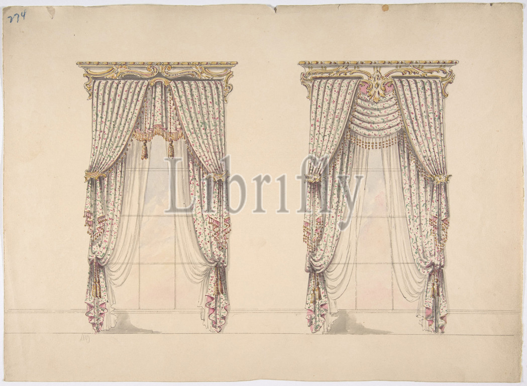Design, Pink, Green, White Curtains, Gold Fringes, Gold, Pediment, early 19th century, Ink, watercolor, wash, sheet, 10 13/16 x 14 15/16, 27.4 38 cm, Anonymous, British, 19th