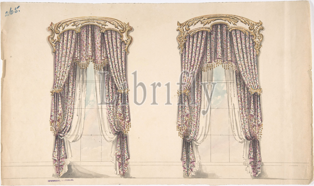 Design, Pink, Mauve, White Floral Curtains, Gold, Pediment, early 19th century, Ink, watercolor, wash, sheet, 8 7/8 x 15 1/16, 22.5 38.2 cm, Anonymous, British, 19th