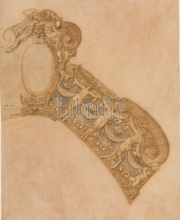 Design for the Pommel Plate of a Saddle from a Garniture of Alessandro Farnese (1545–1592), ca. 1575–80, Parma, Italian, Parma, Pen and brown ink, with color washes, on paper, 19 1/2 x 16 3/8 in. (49.5 x 39.2 cm), Works on Paper-Drawings, This preparatory drawing depicts the front saddle steel of one of the most lavishly decorated armor garnitures of the sixteenth century, made for Alessandro Farnese (1545–1592), duke of Parma and Piacenza