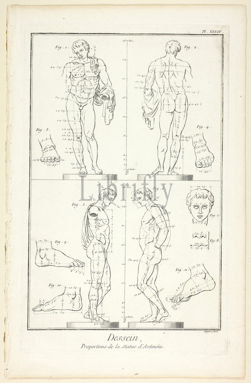 Design, Proportions, Antinoüs Statue, Encyclopédie, 1762/77, A. J. Defehrt, French, active 18th century, published, André le Breton, 1708-1779, Michel-Antoine David, c. 1707-1769, Laurent Durand, 1712-1763, Antoine-Claude Briasson, 1700-1775, France, Etching, engraving, cream laid paper, 317