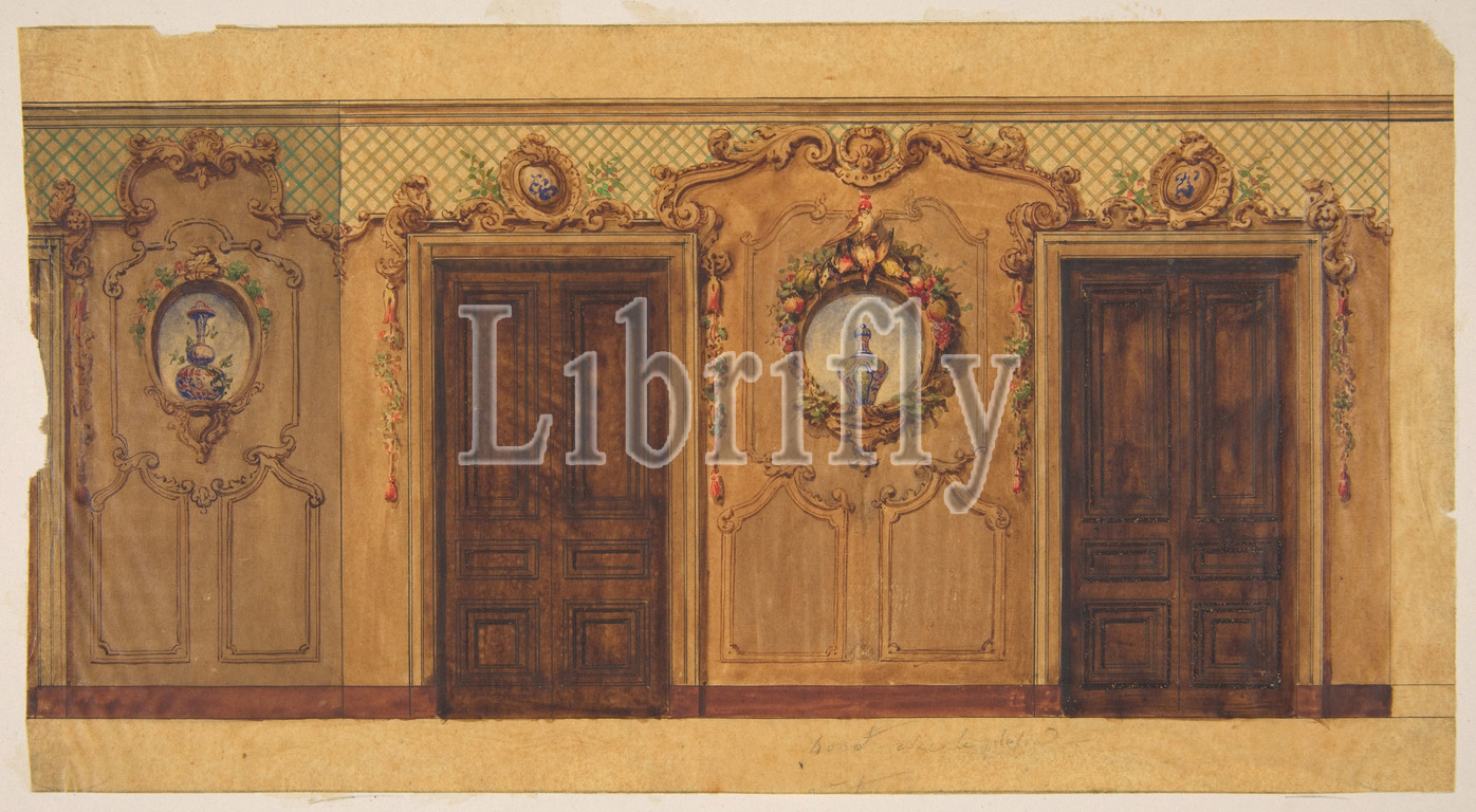 Design, room, double doors decorated, garlands, fruit, flowers, scrolls, lattice work, 1830–97, pen, ink, watercolor, tracing paper, mounted, heavy wove, Overall, 9 1/2 x 12 5/16, 24.2 31.2 cm, Drawings, Jules-Edmond-Charles Lachaise, French, died, 1897, Eugène-Pierre Gourdet, born Paris, 1820
