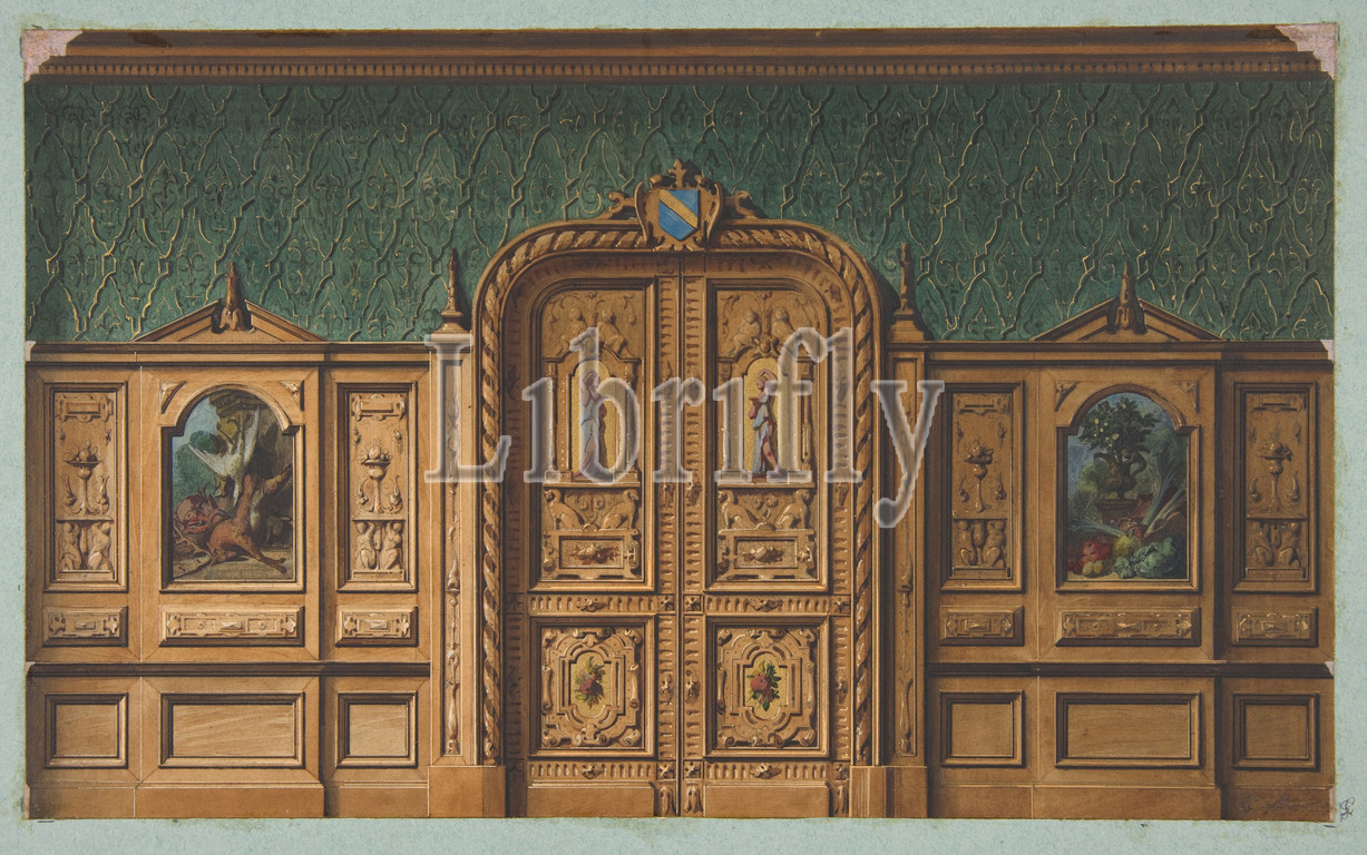 Design, room, wood panels inset, paintings, heavily-carved double door, 1830–97, graphite, pen, ink, watercolor, gold paint, wove paper, mounted, blue wove, Overall, 10 3/8 x 14 3/4, 26.4 37.5 cm, Drawings, Jules-Edmond-Charles Lachaise, French, died, 1897, Eugène-Pierre Gourdet, born Paris, 1820