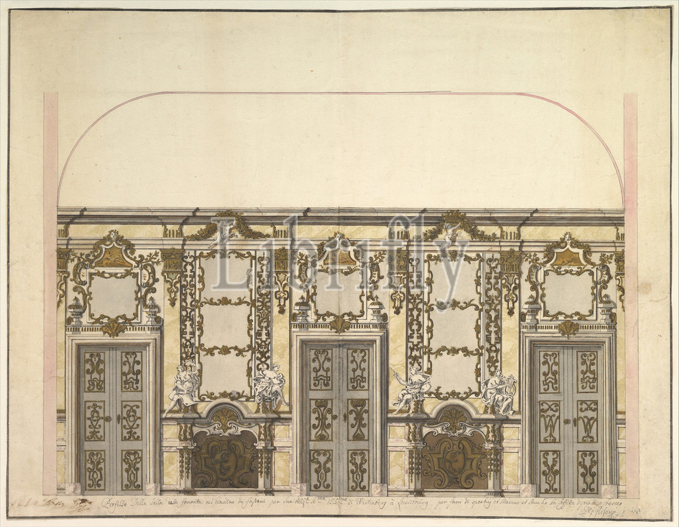 Design, Salon, Pleasure Pavilion, Favorita, Ludwigsburg, 1718, Pen, brown, gray ink, brush, gray, rose, yellow green wash, highlighted, gold, ruled construction, design framed, pen, brown ink outlines, 19-1/2 x 25-3/8, 49.5 64.5 cm, Donato Giuseppe Frisoni, Italian, Laino near Como, 1683–1735, impressive, drawing, design, meant, pleasure pavilion, hunting castle, ‘Favorita, park, Palace, rich, almost fully, symmetrical, executed, late Baroque, style, decorated, gilt stucco, ornaments