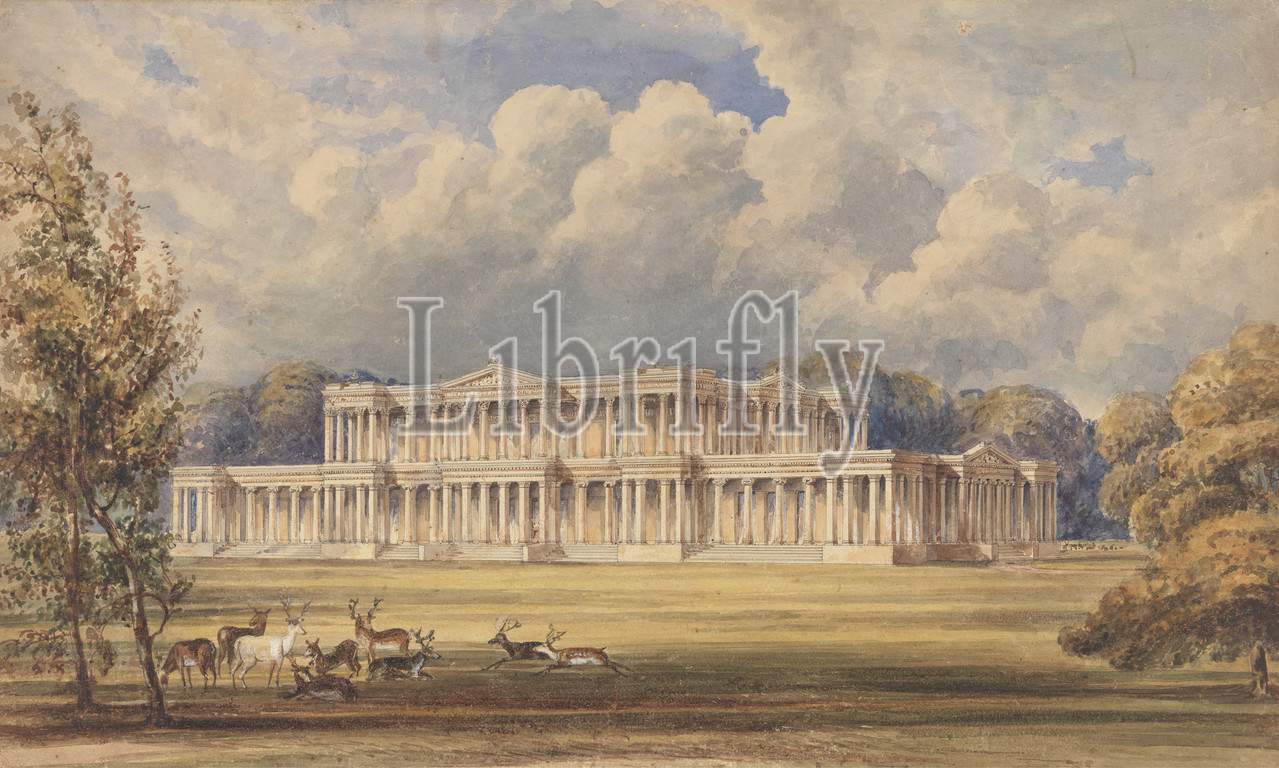 Design, Silverton Park, Devon, studio, James Knowles, c, 1806–1884, British, 1839, 1845, Watercolor, gouache, pen, black ink, graphite, medium, moderately textured, cream wove paper, Sheet, architectural subject, building, columns, deer, pediment, Devon, England, Silverton, United Kingdom