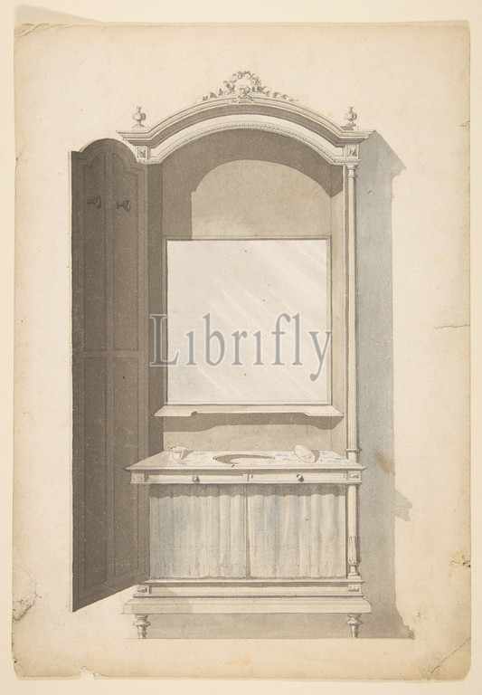 Design for a Sink and Vanity, 19th century, Pen and ink and watercolor on heavy wove paper, sheet: 11 5/16 x 7 7/8 in. (28.8 x 20 cm), Anonymous, French, 19th century