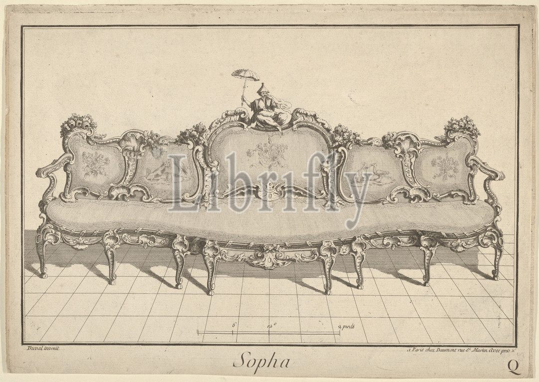 Design, Sofa, Nouvelle Iconographie Historique III, series Q, 1771, Etching, engraving, Plate, 9 1/8, 13 3/16, 23.2, 33.5 cm, Duval, active ca., 1750, –1780, large sofa, late Louis XV, style, sofa, divided up, five parts, center, top, Chinese figure, depicted holding, up, parasol, upholstery, decorated, fables, Fox, Crane, Wolf, Heron, Jean de, la, Fontaine