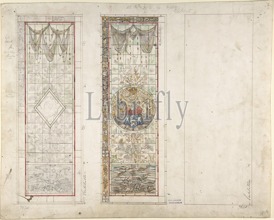 Design, Stained Glass, Marine Motifs, 19th century, Graphite, ink, watercolor, sheet, 18 3/8 x 14 9/16, 46.7 37 cm, John Gregory Crace, British, London, 1809–1889, Dulwich, and Son
