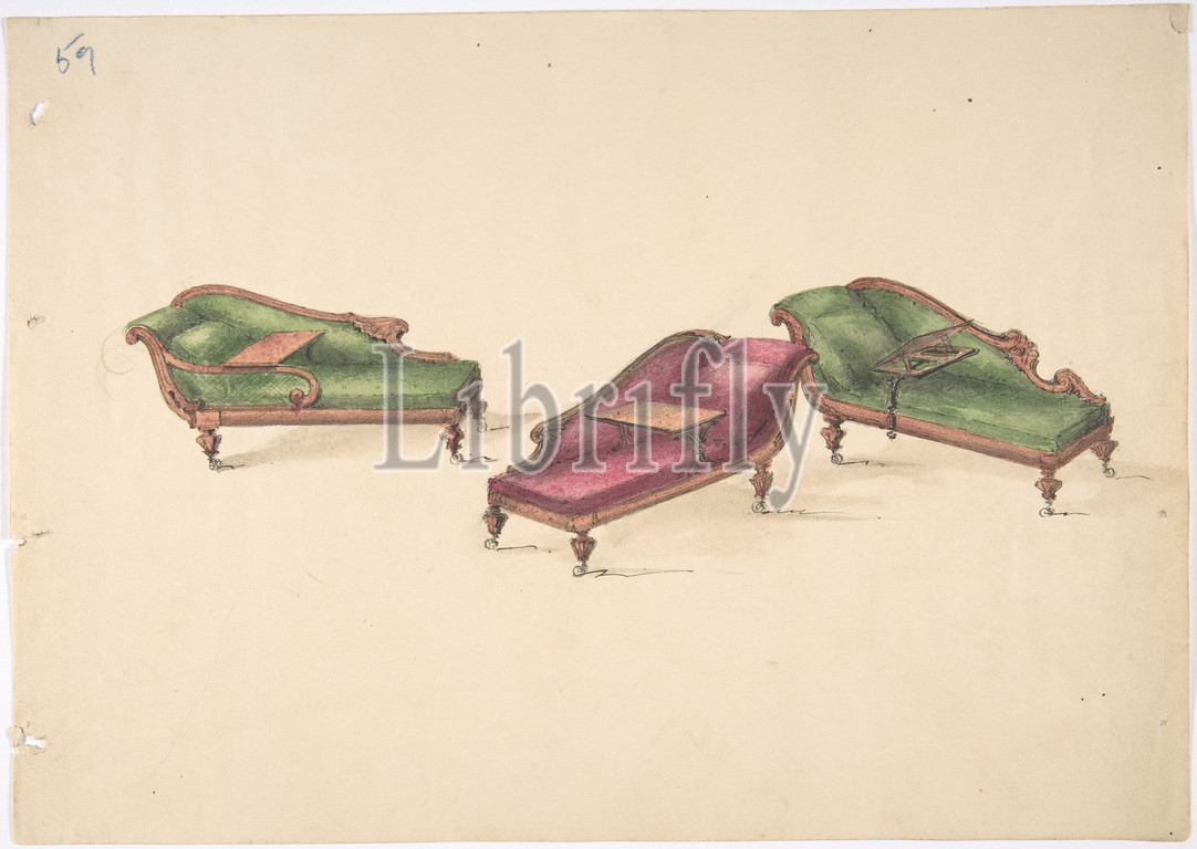 Design, Three Reclined Reading Sofas, Trays, Casters, Upholstered, Green, Red, early 19th century, Ink, watercolor, wash, sheet, 8 11/16 x 12 3/16, 22 31 cm, Anonymous, British, 19th