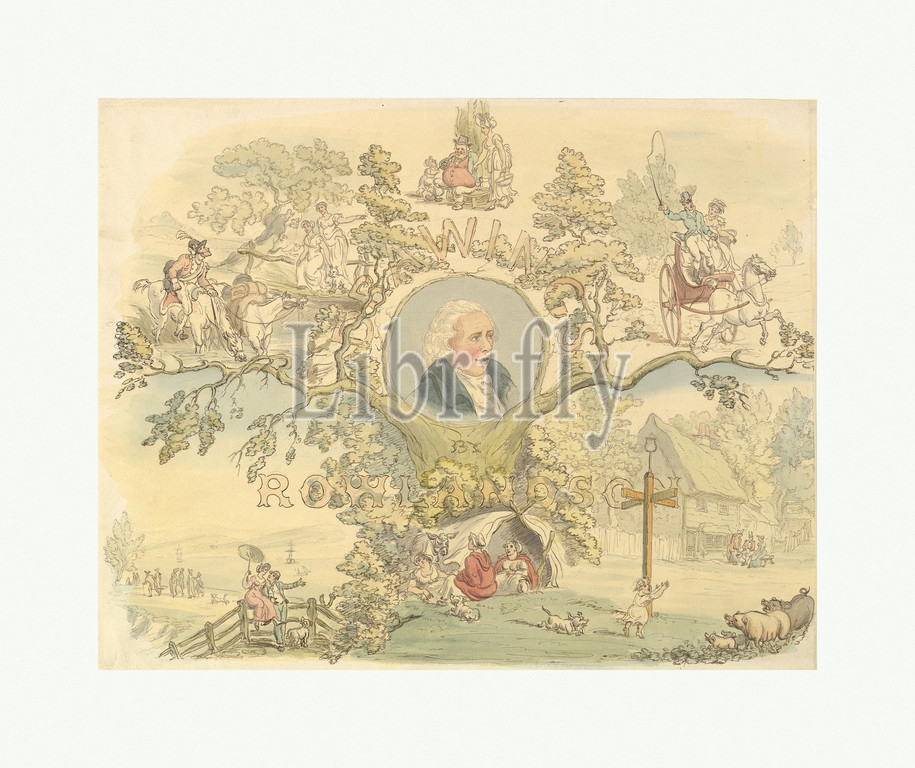 Design for a Titlepage in the Manner of Rowlandson, 1858–1914, Watercolor and ink, sheet: 13 3/8 x 16 15/16 in. (33.9 x 43.1 cm), Drawings, Frederick W. Pailthorpe (British, 1838–1914)