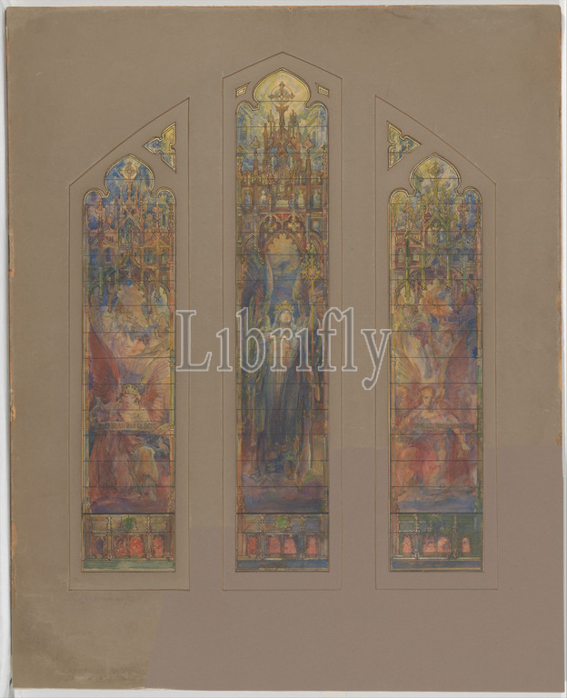 Design, triple lancet window, late 19th–early 20th century, New York, United States, American, Watercolor, gouache, red, black ink, graphite, paper mounted, board within original double matt, Overall, 25 5/8 x 20 7/8, 65.1 53 cm, Drawings, possibly, Tiffany Glass and Decorating Company, 1892–1902, Studios, 1902–32