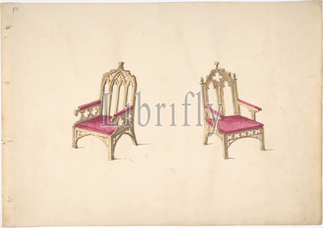 Design, Two Gothic Style Armchairs, early 19th century, Ink, watercolor, wash, sheet, 8 9/16 x 12 3/16, 21.7 31 cm, Anonymous, British, 19th