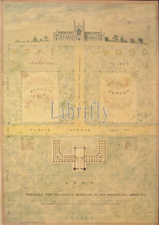 Design, University, Michigan, elevation, plan, building, grounds, ca, 1838, Watercolor, ink, Drawings, Alexander Jackson Davis, American, New York, 1803–1892, West Orange, Jersey
