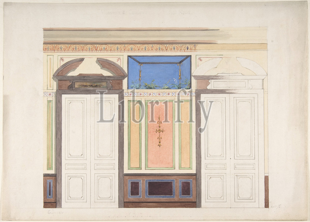 Design, Wall Elevation, Hôtel Candamo, 1873, Pen, black ink, watercolor, 10 11/16 x 14 7/8, 27.1 37.8 cm, Drawings, Jules-Edmond-Charles Lachaise, French, died, 1897, Eugène-Pierre Gourdet, born Paris, 1820
