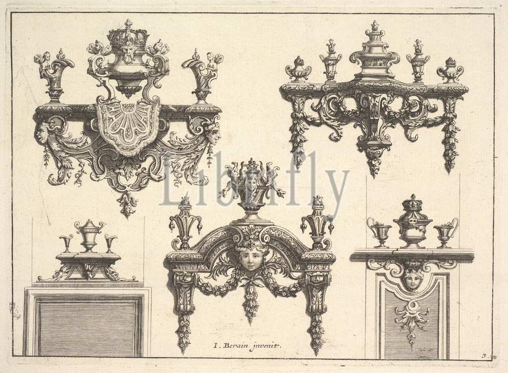 Designs, Brackets, Silverwork, late 17th century, Etching, Engraving, plate, 7 1/2 x 10 1/4, 19 26 cm, Jean Berain, French, Saint-Mihiel, 1640–1711, Paris, engraving, designs, brackets, silverwork, designed, I, Entrusted, drawings, costumes, stage sets, royal ceremonies, Academie Royale, de, la, Musique, 1680, Berain, ingenious creations, acanthus, laurel leaves, palmettes, grotesques, mixing, dancers, acrobats, monkeys, satyrs, create, own, imaginative, theatrical world