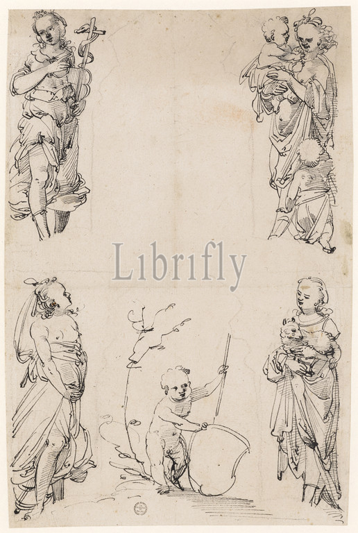 Designs for flanking figures with Fides, Caritas, Patientia, Spes and Putto with empty escutcheon, feather in black, traces of a preliminary drawing with black pencil, Journal: 29.3 x 19.1 cm /19.7 cm, Not indicated, Tobias Stimmer, (Umkreis / circle), Schaffhausen 1539–1584 Strassburg