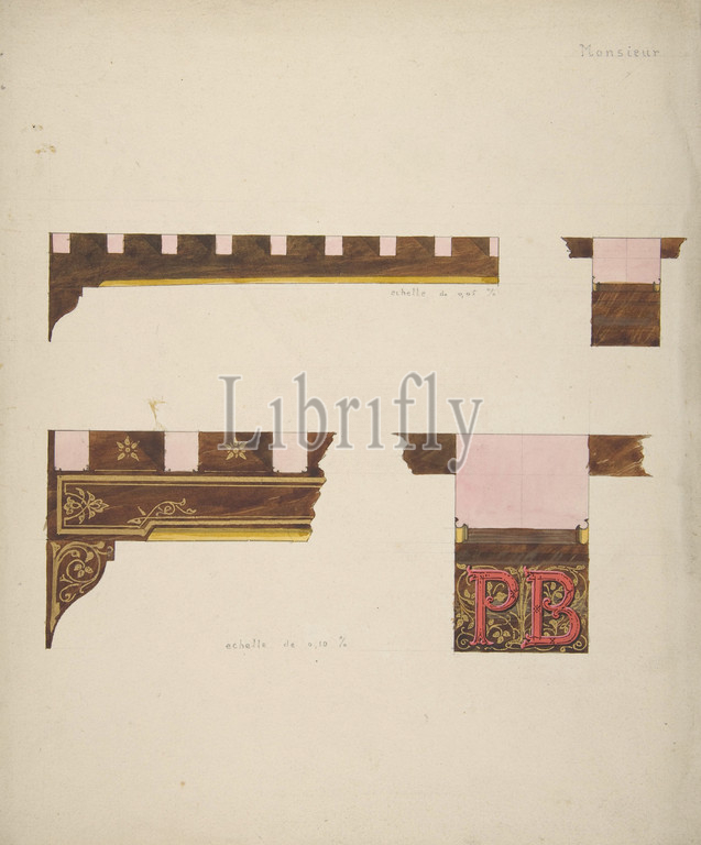 Designs, painted decoration, ceiling timbers monogrammed, PB, second half 19th century, pen, ink, watercolor, gold paint, wove paper, sheet, 10 7/8 x 8 7/8, 27.7 22.6 cm, Drawings, Jules-Edmond-Charles Lachaise, French, died, 1897, Eugène-Pierre Gourdet, born Paris, 1820