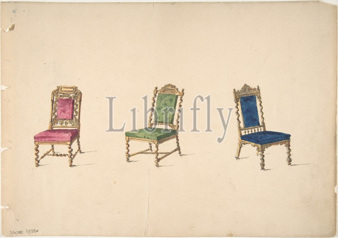 Designs, Three Chairs, Turned Legs, Backs, early 19th century, Ink, watercolor, wash, sheet, 8 3/4 x 12 5/16, 22.2 31.3 cm, Anonymous, British, 19th