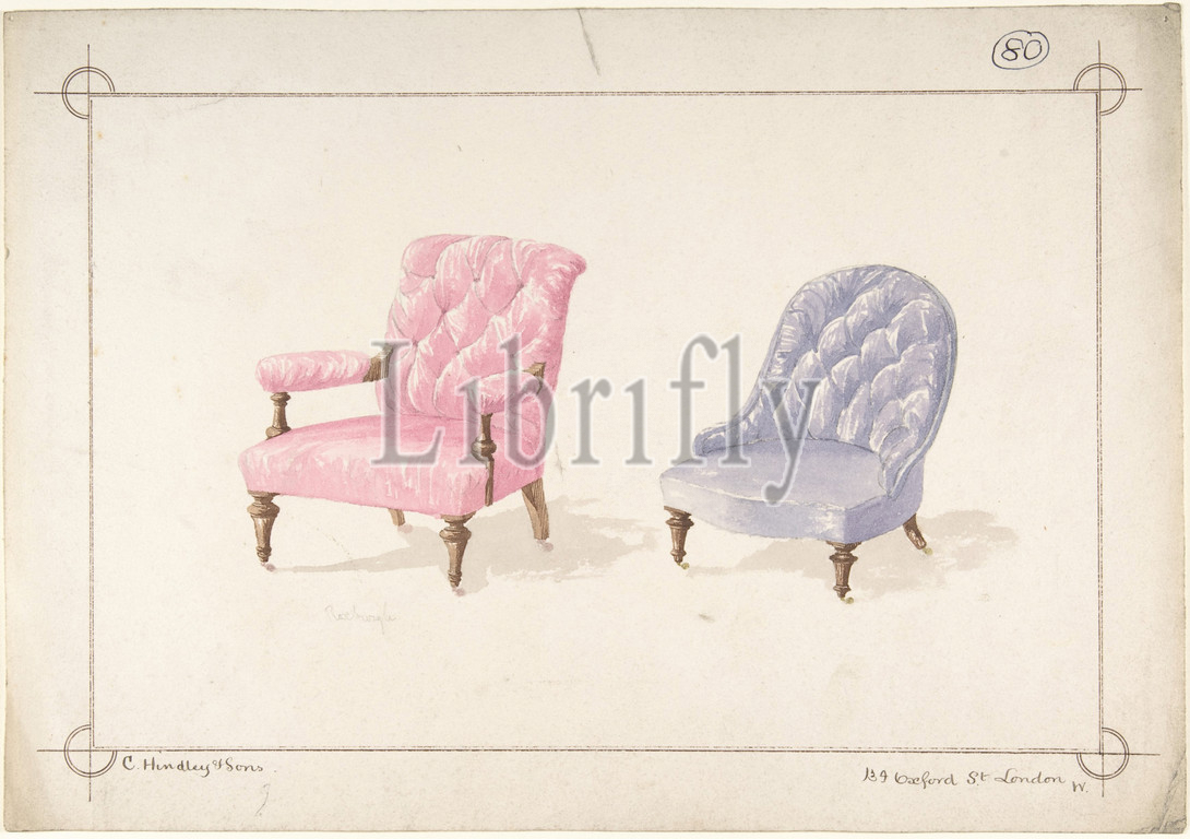 Designs, Two Chairs, 1841–84, Watercolor, graphite, sheet, 9 15/16 x 14 3/16, 25.2 36.1 cm, Charles Hindley and Sons, British, London, 1841–1917
