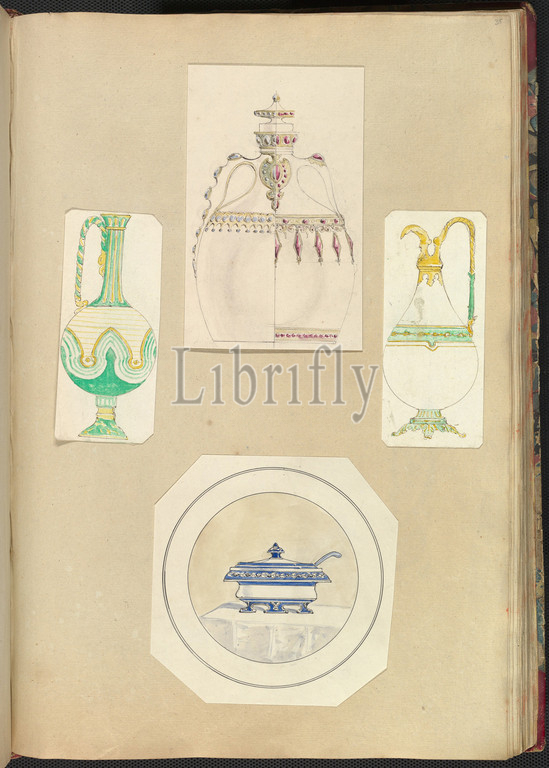 Designs, Two Ewers, Carafe, two alternate designs, Covered Tureen, 1845–55, Pen, ink, watercolor, sheet, 16 3/4 x 11 7/16, 42.5 29 cm, Alfred Henry Forrester [Alfred Crowquill], British, London, 1804–1872