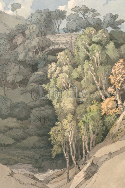 Devil's Bridge, Francis Towne, 1740–1816, British, 1810, Watercolor and black ink over graphite on medium, slightly textured, cream wove paper, Sheet: 10 x 6 5/8 inches (25.4 x 16.8 cm) and Contemporary drawn border: 12 5/8 x 9 3/8 inches (32.1 x 23.8 cm), bridge (built work), forest, landscape, Nature