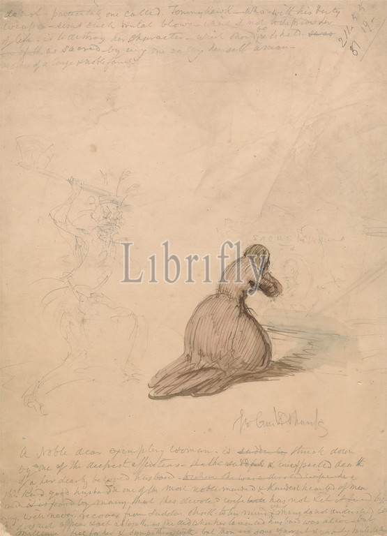 Devoted Wife, George Cruikshank, 1792–1878, British, undated, Graphite, pen and brown ink, and watercolor on medium, slightly textured, beige wove paper, Sheet: 11 3/8 x 8 5/16in. (28.9 x 21.1cm) and Sheet: 11 3/8 × 8 1/4 inches (28.9 × 21 cm), crying, kneeling, wife, woman