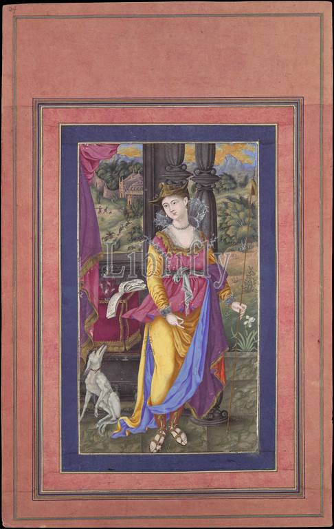 'Diana, Goddess of the Hunt', Folio from the Davis Album, early 17th century, Attributed to India, Ink, opaque watercolor, and gold on paper, Page: H. 13 1/8 in. (33.3 cm), Codices, Although painted by an Indian artist, the style and subject of this painting of the Goddess Diana are distinctly European. It was likely painted in India during the reign of the Mughal emperor Jahangir (1605–27), who was an avid collector and connoisseur