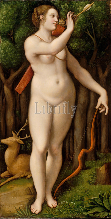 Diana, Huntress, Oil, wood, 44 7/8 x 23 1/4, 114 59.1 cm, Paintings, Giampietrino, Giovanni Pietro Rizzoli, Italian, Milanese, active by ca., 1495–died, 1553, faithful Milanese pupils, Leonardo da, Vinci, picture, goddess, hunt drawing, arrow, inspired, famous set, engravings designed, Florentine Rosso, Fiorentino, 1494–1540, dated 1526