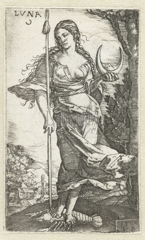 Diana Luna, title, object, Gods sitting, seven planets, series title, Diana, moon goddess Luna, standing, star statue lobster, staff, right hand, crescent moon, hot left, moon-goddess, ie Luna, Selene, Monogrammist IB, 16e eeuw, mentioned, Germany, 1529, paper, engraving