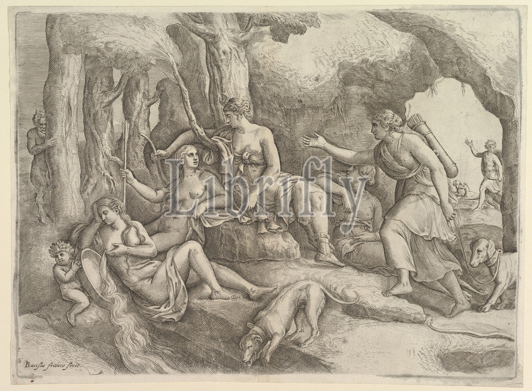 Diana Resting, Nymphs, Etching, engraving, second state, sheet, 11 11/16 x 15 7/8, 29.7 40.3 cm, Prints, Battista Franco, Italian, Venice ca., 1510–1561, Venice