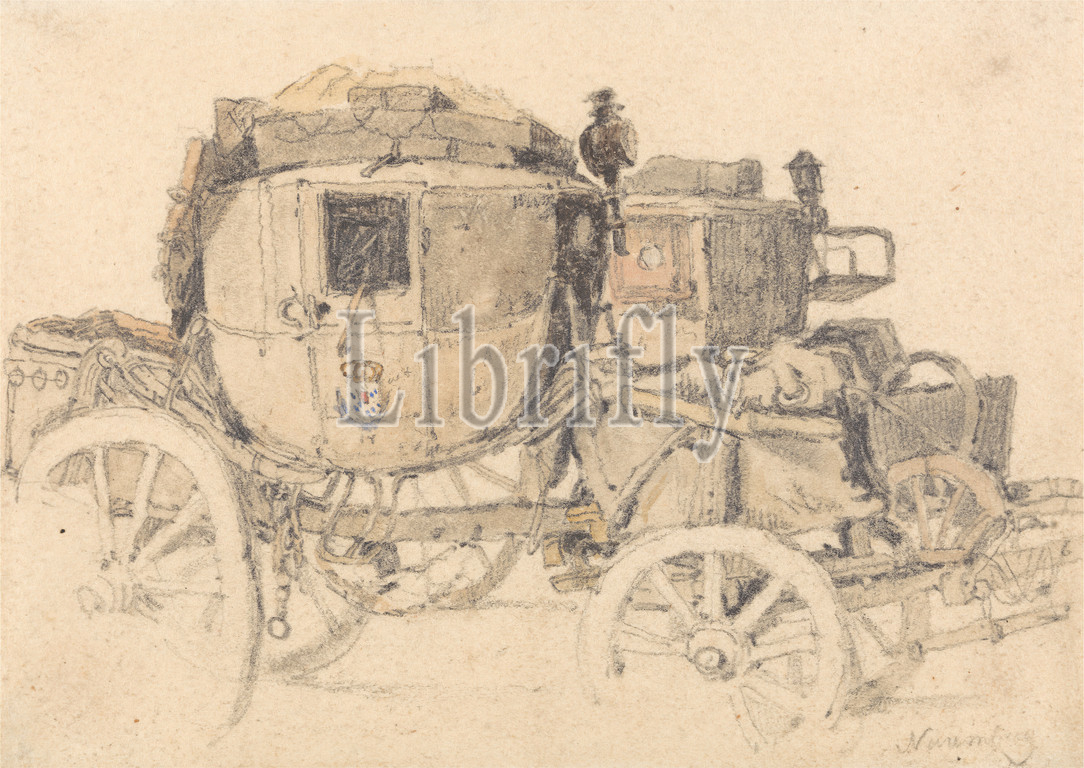Diligence, Side View, Nuremberg, Samuel Prout, 1783–1852, British, Graphite, watercolor, moderately thick, moderately textured, beige, wove paper, Sheet, boxes, containers, cargo, carriage, luggage, stagecoach, life, straps, suitcases, travel, wheels, Bayern, Europe, Germany, Mittelfranken, Nuremberg
