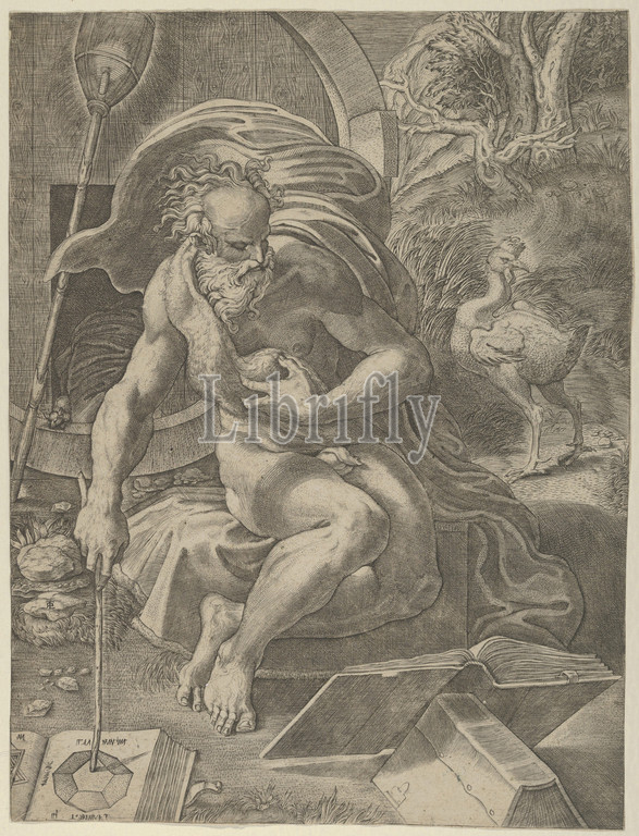 Diogenes seated with his barrel behind him, and reading a book while holding a stick that rests on a geometry book to his right, 1524–27, Engraving, Sheet: 11 1/4 × 8 9/16 in. (28.6 × 21.7 cm) trimmed within platemark, Prints, Giovanni Jacopo Caraglio (Italian, Parma or Verona ca. 1500/1505–1565 Krakow (?)), After Parmigianino (Girolamo Francesco Maria Mazzola) (Italian, Parma 1503–1540 Casalmaggiore), This engraving of the Greek philosopher Diogenes follows a design by Parmigianino. In contrast to The Marriage of the Virgin it is striking how little of the copper plate Caraglio left unworked, using controlled tonal differences to achieve a highly nuanced chiaroscuro palette