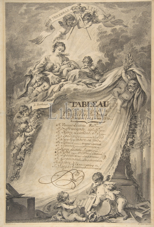 Diploma, Freemasons, Bordeaux, François Boucher, 1766, Etching, engraving, fourth state, four, Jean-Richard, 16 3/16 x 11 5/16, 41.1 28.7 cm, Prints, Pierre Philippe Choffard, French, Paris, 1730–1809