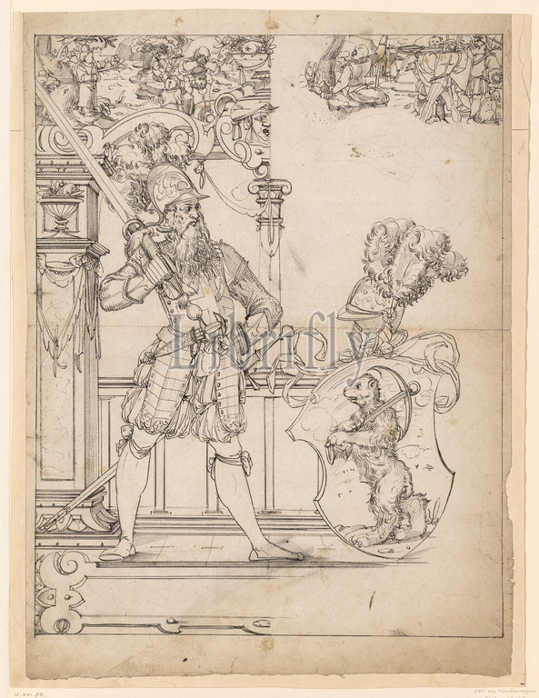 Disc tear, shield companion, bear coat, arms, upper pictures Tell's apple shot, Gessler's death, feather, black, traces, preliminary drawing, black pencil, mounted, sheet, 48.7 x 35.5 cm, Image, 43.7 x 34.3 cm, color information, Tobias Stimmer, Umkreis, circle, Schaffhausen 1539–1584 Strassburg, Orpheus-Meister