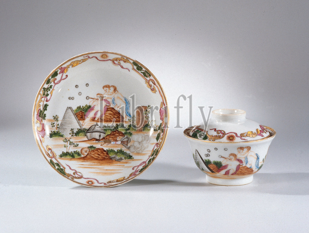 Dish, cup, saucer Bell-shaped covered cup, saucer, symbolic image, three putti, different objects, Bell-shaped lid cup, porcelain, painted, glaze, blue, red, pink, green yellow, brown, black, gold, plate, dish, symbolic representation, blows soap bubbles, pipe, wicker basket, pyramid, skull, mask, crown, globe, books, objects, edge, band, leaf vines, two radiant suns, face, Presentation, drawing, Jacob de Wit, 1695-1754, Allegory, transience, European representation, enamel colors, Amsterdam, c, 1750, 1760, Qing-dynasty, 1644-1912, Qianlong-period, 1736-1795, material, metal, vitrification