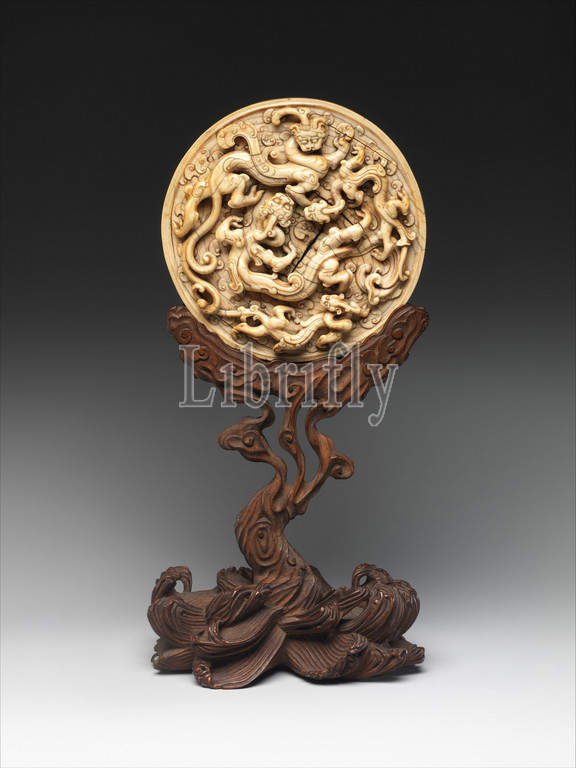 Disk, Dragons, Yuan, 1271–1368, –Ming, 1368–1644, dynasty, 14th–15th century, China, Ivory, H, 10 1/8, 25.7 cm, Diam, 4 9/16, 11.6, Ivories, disc, inlay, decorate another, piece, furniture, screen, functioned, independent work, art, chihulong, four snakelike, dragons—two, large, two small—prowling, surface, identifiable, long, narrow necks, raised lines, across, backs, branching tails