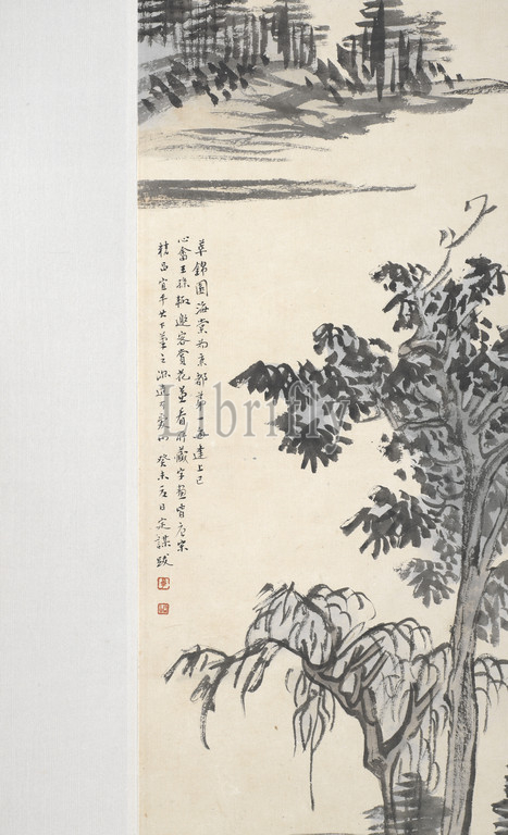 Distance, Rivers, Mountains, Pu Ru, Chinese, 1896-1963, Modern {Chinese period}, 1943, ink, color, paper, 33 x 12-5/8, image, 67-1/2 x 18-7/8 x 1-1/4, overall, Signed, Xinyu Seal, Yi duo hong yun Seal, Jiu wang sun Seal, Pu Ru Colophon, Zhuo Dingmou, 1886-1977, dated 1943, Asian Art