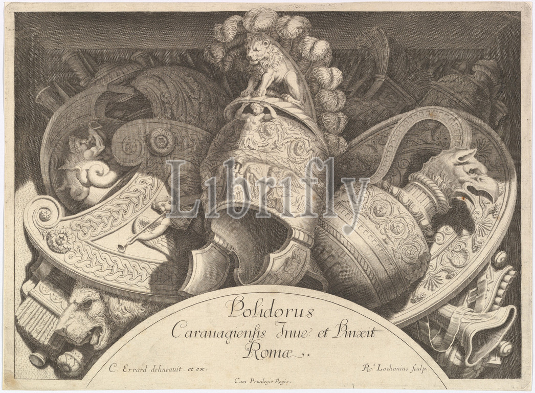 Divers Trophées, Weapon Trophies, Façade, Palazzo Milesi, Rome, 1651, Engraving, Plate, 8 13/16 x 11 15/16, 22.4 30.4 cm, Polidoro da Caravaggio, Italian, Caravaggio ca., 1499–ca., 1543, Messina, René Lochon, French, Boissy, 1636–1675, Paris, Print, series, six reproducing, weapon trophies, second floor windows, designed, executed, da, Caravaggio, 1525, 26, print, large trophy, Roman centurion, helmet