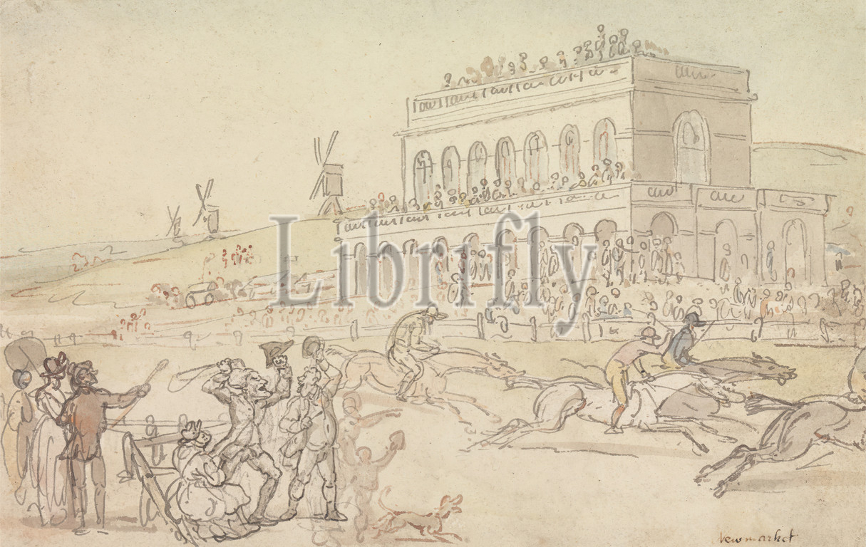 Doctor Syntax loses, Money, Race Ground, York, Thomas Rowlandson, 1756–1827, British, 1820, Watercolor, graphite, pen, black ink, pen, gray ink, pen, red-brown ink, medium medium, slightly textured, cream, wove paper, Sheet, building, crowd, dog, animal, fence, hats, horses, animals, jockeys, men, money, race, event, racetrack, racing, sporting art, windmills, windows, women, England, Europe, North Yorkshire, United Kingdom, York