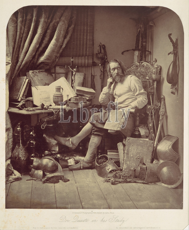 Don Quixote in His Study, 1857, Albumen silver print from glass negative, Image: 31.9 x 28 cm (12 9/16 x 11 in.), Photographs, William Frederick Lake Price (British, London 1810–1896 Lee, Kent), This carefully staged tableau was among the most widely admired Victorian photographs. Price self-consciously sought to elevate the still-new medium to the level of 'high art' by emulating the ambitious literary subjects, expressive gestures, and period details of grand history painting