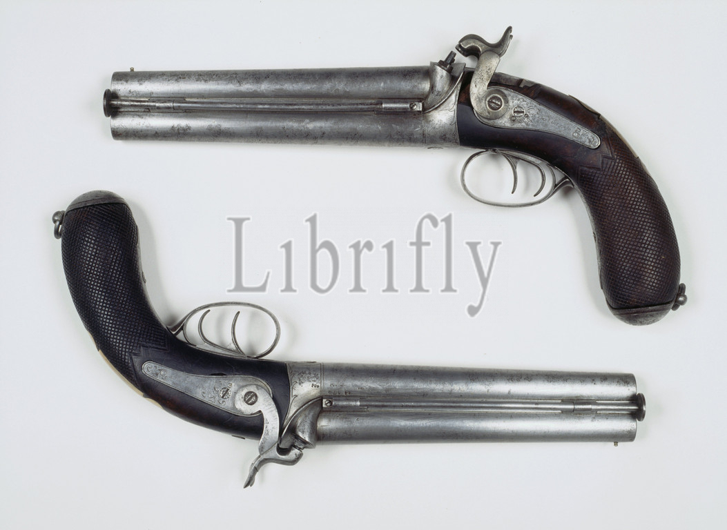Double-barreled pistol with percussion lock, Equestrian pistol with percussion lock and double smooth running round, part of torque. Marked ELG and various inspection marks. The barrel has the number 174 'and on the closing plate on the right: JOHN DONAGHY' and on the left: AMSTERDAM '. Slightly engraved. Brass thumb plate. Machined handle. Support ring on butt plate. On the upper barrel a visor grain and to the side of the barrel an iron loading stick., Netherlands, John Donaghy, Amsterdam, c. 1820 - c. 1850, kolfkap, loop, slotplaat, haan, kolf, engraving, l 32.5 cm l 17.6 cm d 17.5 mm