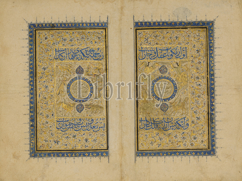 Double Title Page, `Aja'ib al-Makhluqat wa Ghara'ib al-Mawjudat, Wonders, Creation, Oddities, Existence, 1414–35, Attributed, Iran, Shiraz, Ink, opaque watercolor, gold, paper, Ht, 11 3/4, 29.8 cm, Codices, Marvels, Creation contained, information, various aspects, heavens, earth, minerals, plants, birds, animals, well, unusual phenomena, imaginary creatures, rukh, roc, anqa, fabulous bird, attacking, elephant, karkadann, rhinoceros, right, medallion, left, depicted two, tigers, dragon, phoenix, ch'-lin, another fabulous, creature