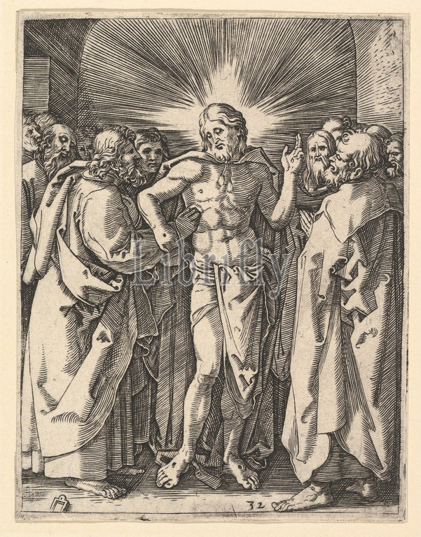 Doubting Thomas, Christ, disciples, Saint Thomas touching Christ, wound, Dürer, ca, 1500–1534, Engraving, second state, three, Sheet, 5 1/16, 3 15/16, 12.9, 10 cm, Prints, Marcantonio Raimondi, Italian, Argini, ca., 1480–before, 1534, Bologna, After Albrecht Dürer, German, Nuremberg, 1471–1528