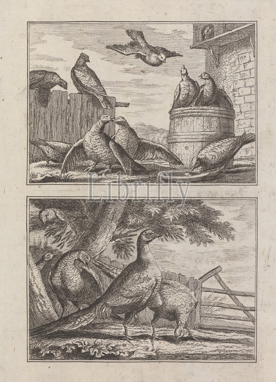 Doves, Pheasants, two plates, sheet, New Kind, Drawing Book.., various kinds, Birds Drawn, Life, Mr, Francis Barlow' 1731, 1, 9, Print, George Bickham, 1683, 4–1758, British, Francis Barlow, ca, 1626–1704, British, Published, Henry Overton, 1675, 6–1751, British, 1731, Etching, medium, smooth, cream laid paper, Sheet, Plate, Image, Image, animal art, barrel, birds, courtship, dish, doves, eating, farm, farmyard, fences, flying, pheasants, singing, trees