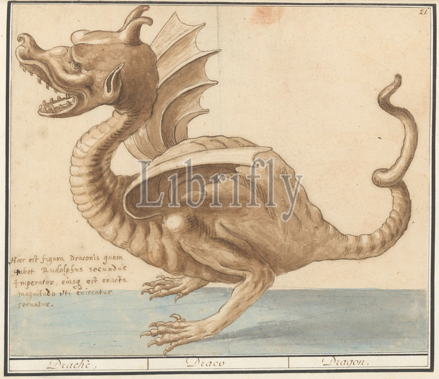 Dragon, Dracke, Draco, title, object, left, inscription, Latin, Numbered top right, 21, Part, seventh album, drawings, reptiles, amphibians, natural history ensembles, seventh, twelve albums, watercolors, animals, birds, plants, 1600, commissioned, Emperor Rudolf II, explanation, Dutch, French, dragon, Anselmus Boetius de Boodt, Praag, 1596, 1610, paper, pencil, chalk, watercolor, paint, ink, pen