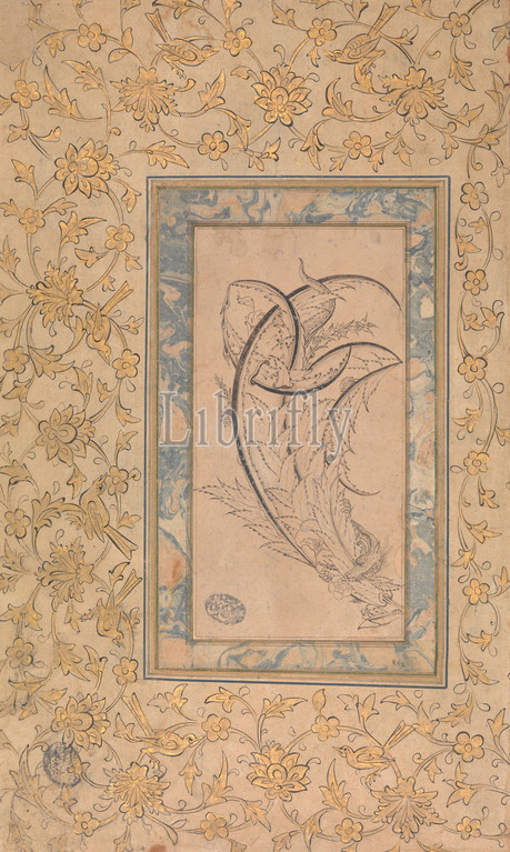 Dragon Wrapped, Saz Leaves, ca, 1550–70, Turkey, Istanbul, Main support, ink, paper, Painting, H, 12, 18.6 cm, Codices, drawing, executed, black ink, tan paper, represents stylized, broken, leaves, dragon, entwined, outer border, pale marbling, surrounds, inner composition, further outer, border, gold, black, filled, repeating decorative, pattern, scrolling vines, bearing, blossoms, birds