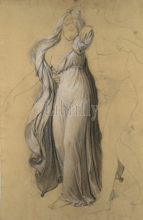 Drapery Study, Castor, Pollux Freeing Helen, 1817, Black chalk, stumping, white, black crayon, buff laid paper, sheet, 17 15/16 x 12, 45.6 30.5 cm, Drawings, Joseph-Ferdinand Lancrenon, French, 1794–1874, study, Freeing, Helen, assigned subject, 1817 Prix, de, Rome, competition, Lancrenon placed, third, final painting, location, unknown, preparatory drawing, focuses, drapery