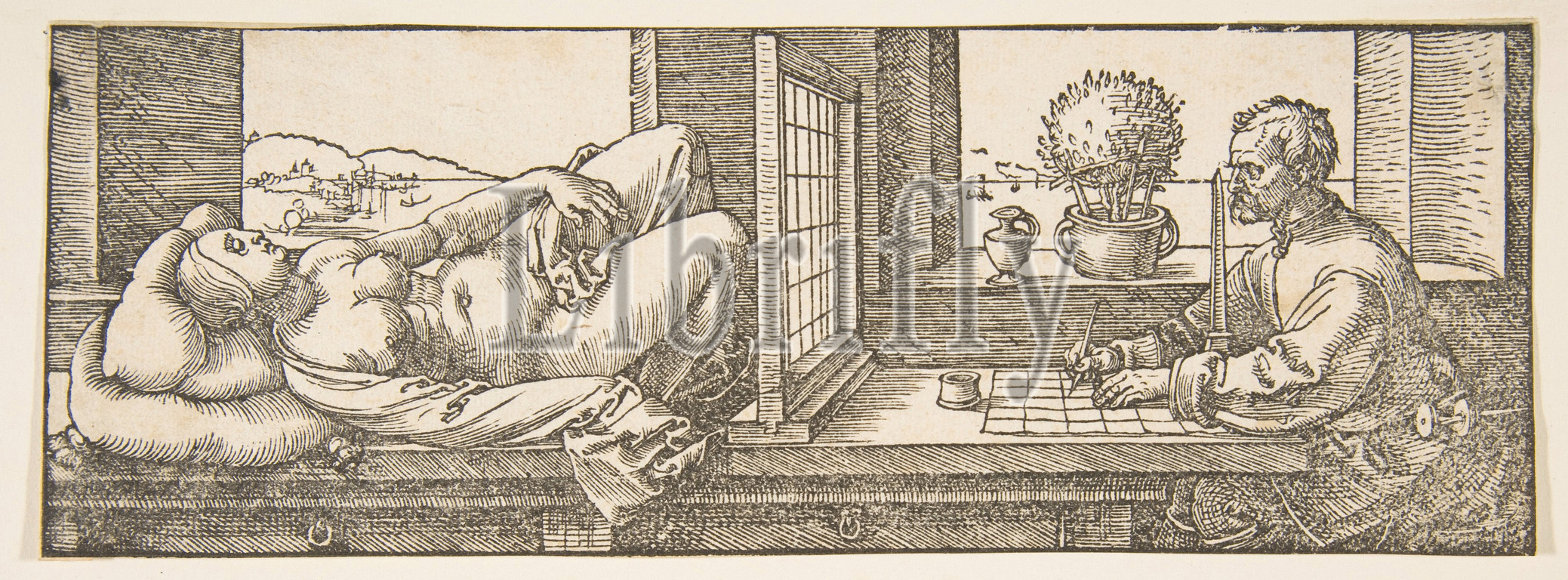 Draughtsman Making a Perspective Drawing of a Reclining Woman, ca. 1600, Woodcut, sheet: 3 1/16 x 8 7/16 in. (7.7 x 21.4 cm), Prints, Albrecht Dürer (German, Nuremberg 1471–1528 Nuremberg)